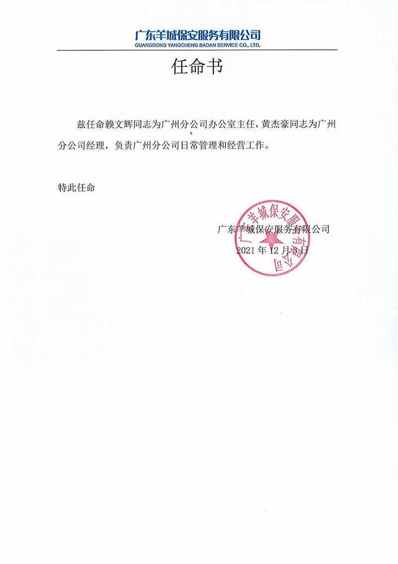 石家庄天宇高级餐饮管理有限公司关于黄杰豪与赖文辉的任命书正式通知